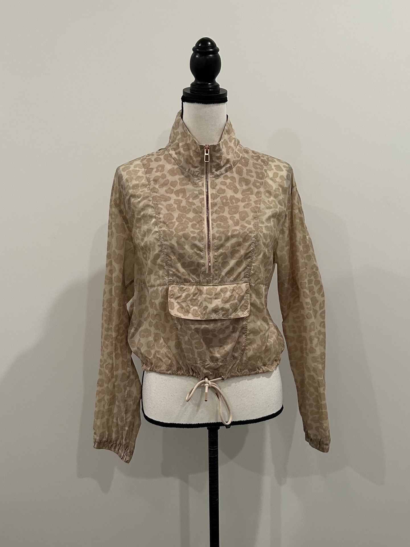 Good American animal print windbreaker. Tan and beige print. Rose gold hardware. Mock neck. Long sleeves. Front pouch. Adjustable tie at the bottom. Very lightweight. Size 3 which is the equivalent of a L. Approximate Measurements: Pit to pit - 20” Shoulder to hem - 18” Nylon 15