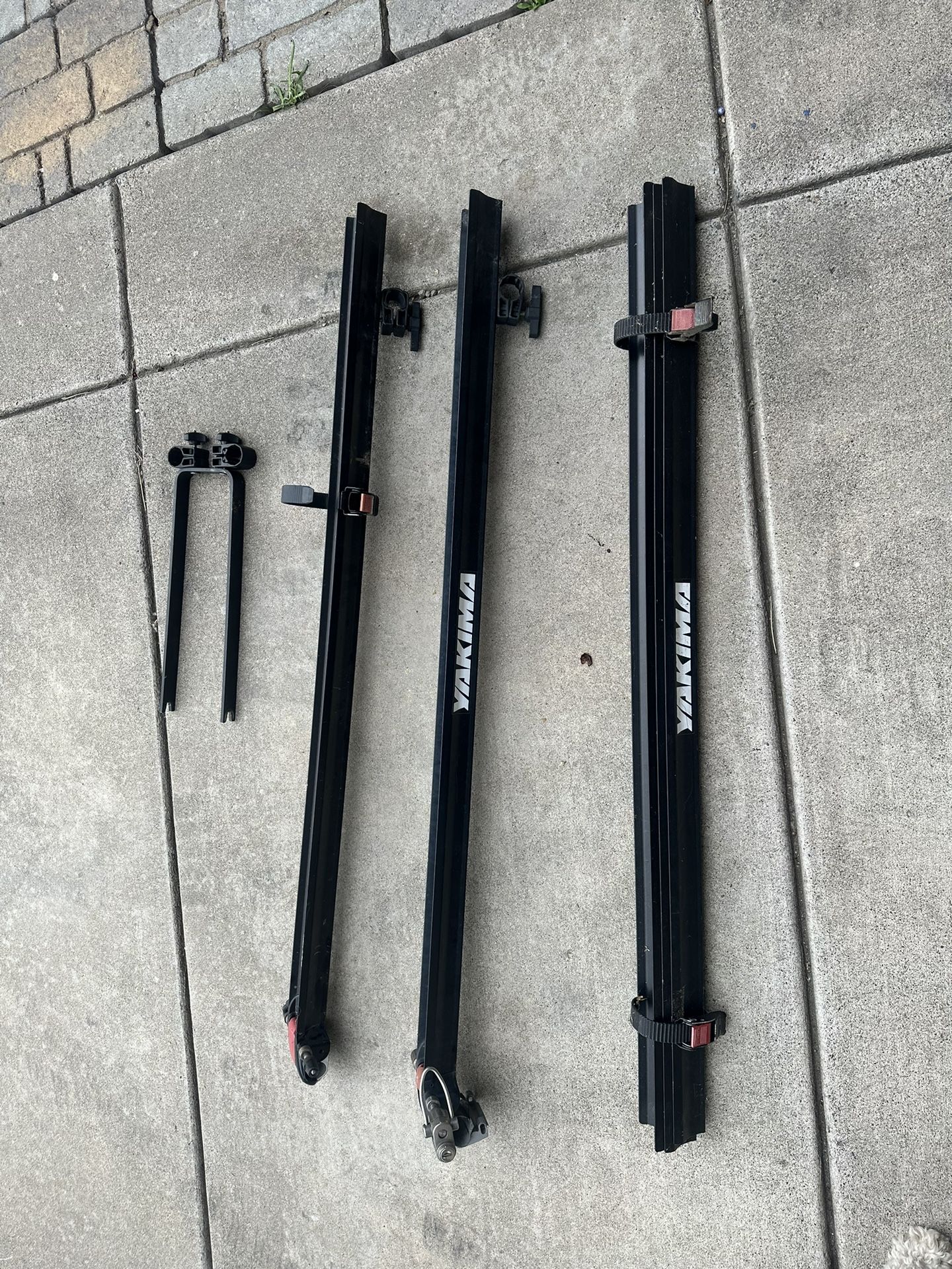 Yakima fork mount roof rack. Five trays, one lock with key, and one wheel holder