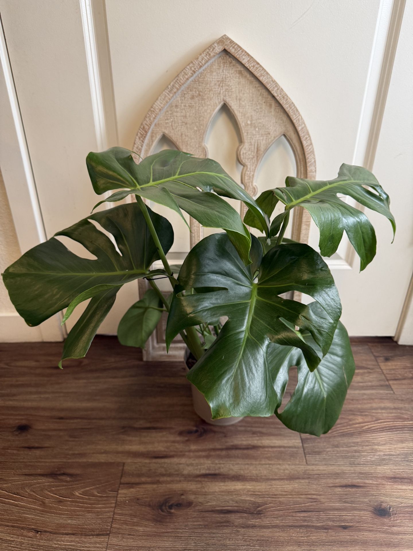 Monstera Deliciosa Very healthy Low maintenance Likes bright indirect light Could tolerate low light Prefers well draining soil Perfect for indoors or outdoors Measures about 2ft tall
