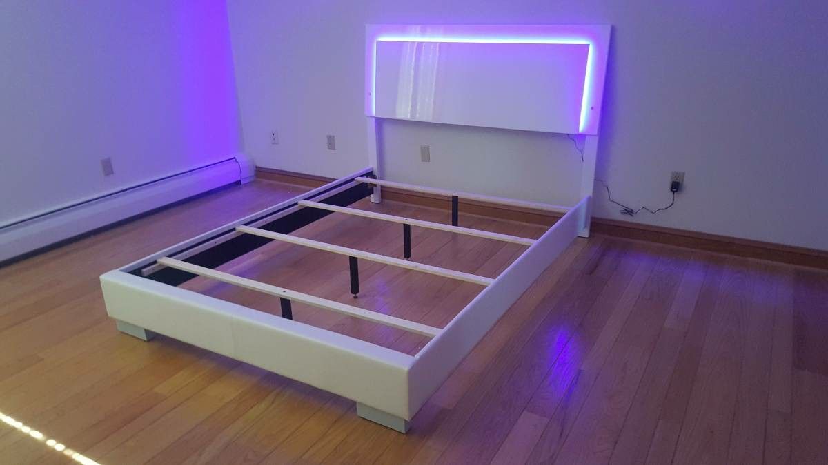 Brand new in Boxes. Complete Queen size bed frame with BLUE LED lighting. Price is firm Queen size: $325 Delivery available for $35 Features exquisite contemporary design. High end white polyurethane coated and polished to a high gloss finish. Bed headboard features blue LED lighting. Polished chrome metal handles. Upholstered side panels and foot panel for soft smooth feel. MATTRESS AND BOX SPRING (NOT INCLUDED) LOCAL DELIVERY AVAILABLE FOR $35 MAX Bed W8 is 600 lbs LED Lighting Helps to create a cool and calm ambience effect Led light is dimmable. You can adjust the brightness. Dimensions (Queen) dimensions 63.50′′W x 86.50′′D x 48.50′′H