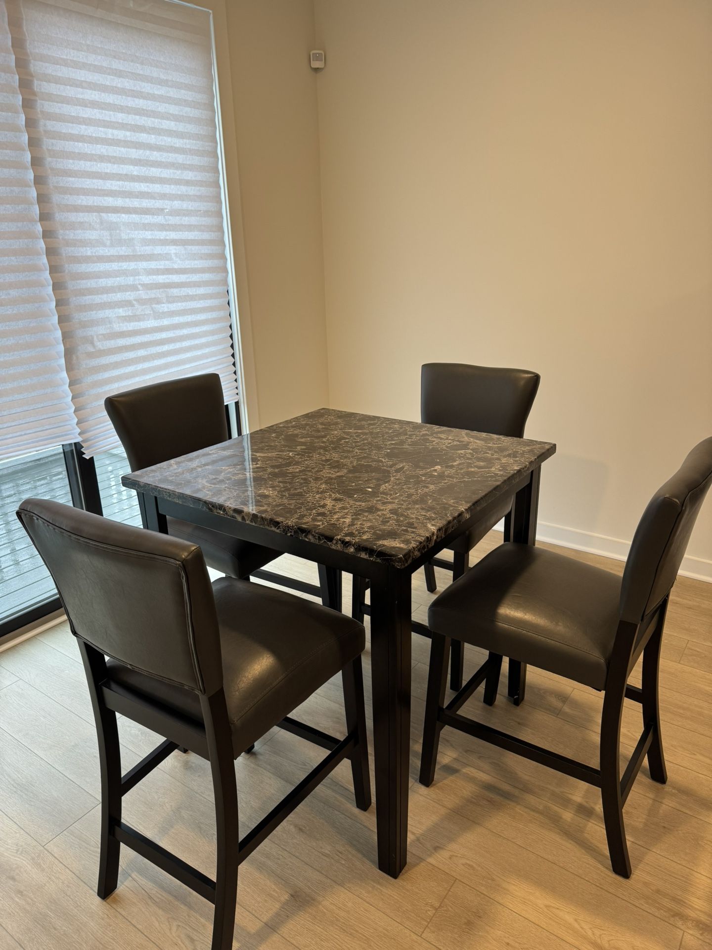 Gently used black marble table and four chairs for sale!! High top table that seat four comfortably. Condition like new, with few scratches on table legs as pictured. Chairs purchased in 2025.
