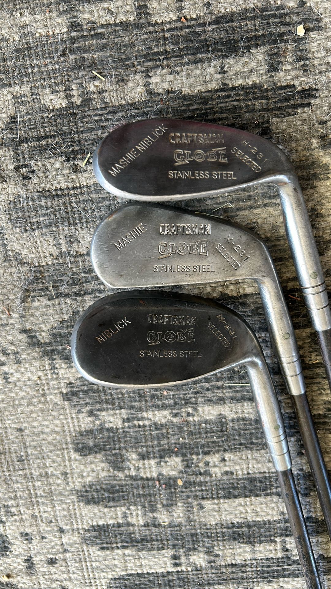 Craftsman Globe set of three Mashie Niblick Mashie Niblick Cane shafts leather grips The cash price is firm, but I do trade. Thanks for looking.