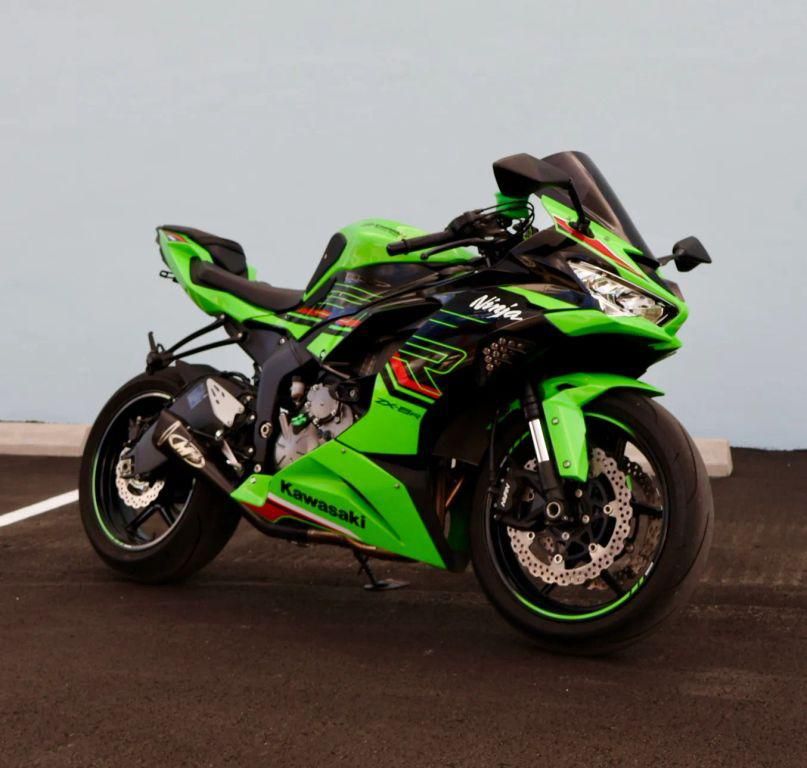The 2023 Kawasaki Ninja ZX-6R KRT Edition features a 636cc inline-four engine, 6-speed transmission with an upshift-only quickshifter, Showa Big Piston front forks, KRT graphics, and advanced electronics like KTRC (Traction Control) and Power Modes, optimized for both street and track use, weighing around 430 lbs with ABS. Engine & PerformanceEngine: 636cc, 4-stroke, In-Line Four, DOHC, 16-valve, liquid-cooled.Fueling: Digital Fuel Injection (DFI) with 38mm Keihin throttle bodies.Power: Around 127-134 hp, optimized for street & track.Torque: About 49-52 ft-lbs. Chassis & SuspensionFrame: Aluminum perimeter frame.Front Suspension: 41mm inverted Showa SFF-BP fork, fully adjustable.Rear Suspension: Bottom-link Uni-Trak with gas-charged shock, fully adjustable.Brakes: Dual 310mm petal discs with Nissin 4-piston calipers (front), 210mm petal disc (rear), available with ABS. Electronics & FeaturesRider Aids: Kawasaki Traction Control (KTRC), Power Modes, Kawasaki Intelligent Anti-lock Brake System (KIBS) (ABS model).Quick Shifter: Kawasaki Quick Shifter (KQS) (upshift only).Clutch: Assist & Slipper Clutch.Instrumentation: Multi-function LCD screen, Economical Riding Indicator, LED headlights/taillight.