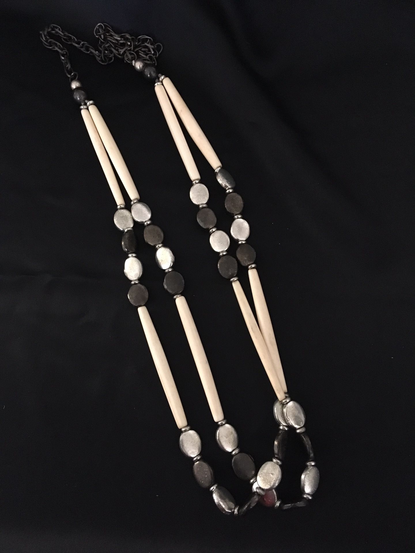 Collar con cuentas de cristal y barras de marfil, hecho en Zimbabue.