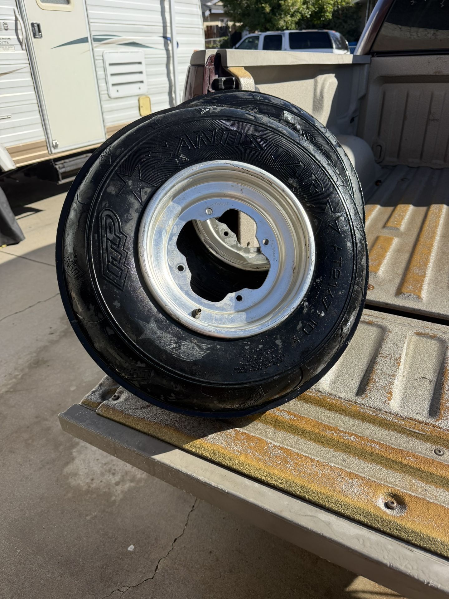 Front sand tires for a Yamaha bolt pattern 1 tire is slightly cracked but it holds air. $50 for both
