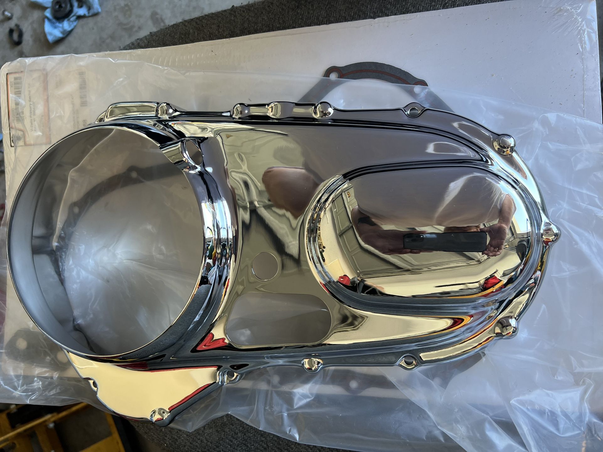 Up for sale is a Harley Sportster Primary Case trim cover in chrome. Piece is brand new never used. It is NOT the actual primary cover that holds the oil, it is a chrome trim cover that goes on top. So if you have a rusty or faded primary cover, this chrome trim will make it look brand new.