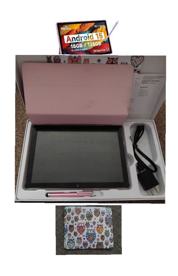 Tablet w/pink case, stylus and owl print mouse & mouse pad. Charger included. Hardly used-Like New