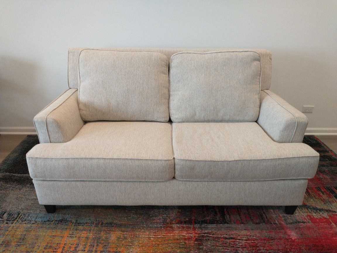 Woven fabric love seat. Grey/white/brown color goes with anything. Good condition. *Also selling matching couch. Dimensions Length: 66 3/4" Width: 40 1/2" Height: back height 36", seat height 18"