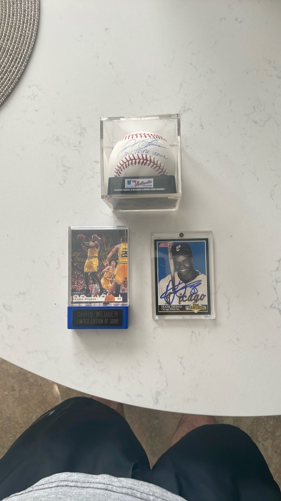 Autographed Miguel Cabrera baseball with 2012 triple crown written out. Frank Thomas autographed card and Chris Webber 187/ 3000 numbered autographed card.