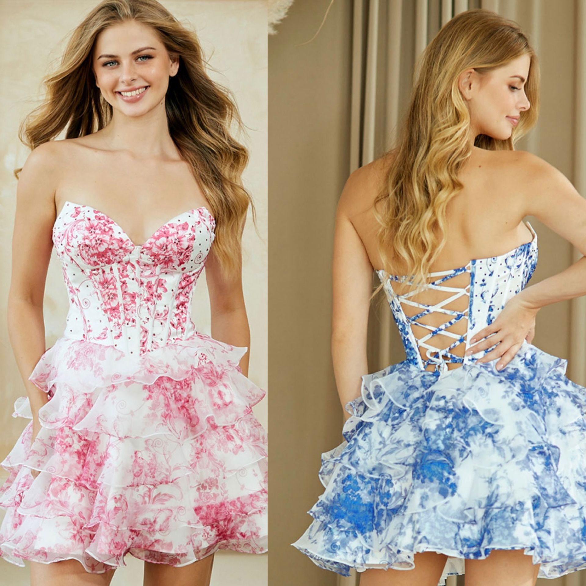 New With Tags Floral Corset Back Short Formal Dress & Homecoming Dress $169 In stock in Pink in Sizes 4 & 8 and Blue in Sizes 0, 2, 6, 8 & 10. Available in Pink & Blue in Sizes 0-12. See picture of size chart & measure before purchasing. Message for more information and details.