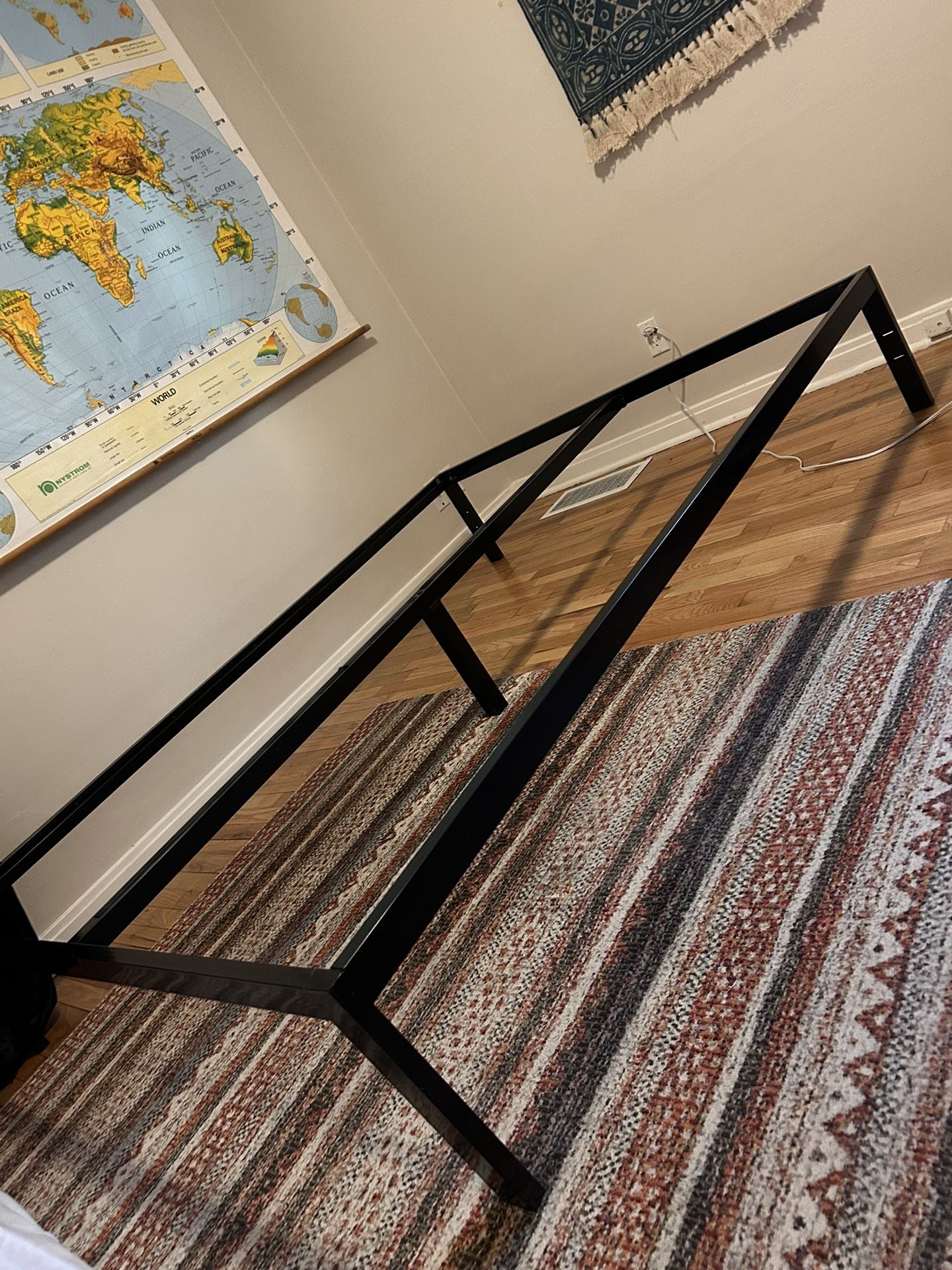 Super simple black bed frame. Has wooden slats that go across, so no need for a box spring. I had removed them before taking the photo. Everything is broken down for easy transport. Great condition, sturdy. You can have the memory foam mattress for free, if you want it. It has a few small stains but the cover comes off and is washable.
