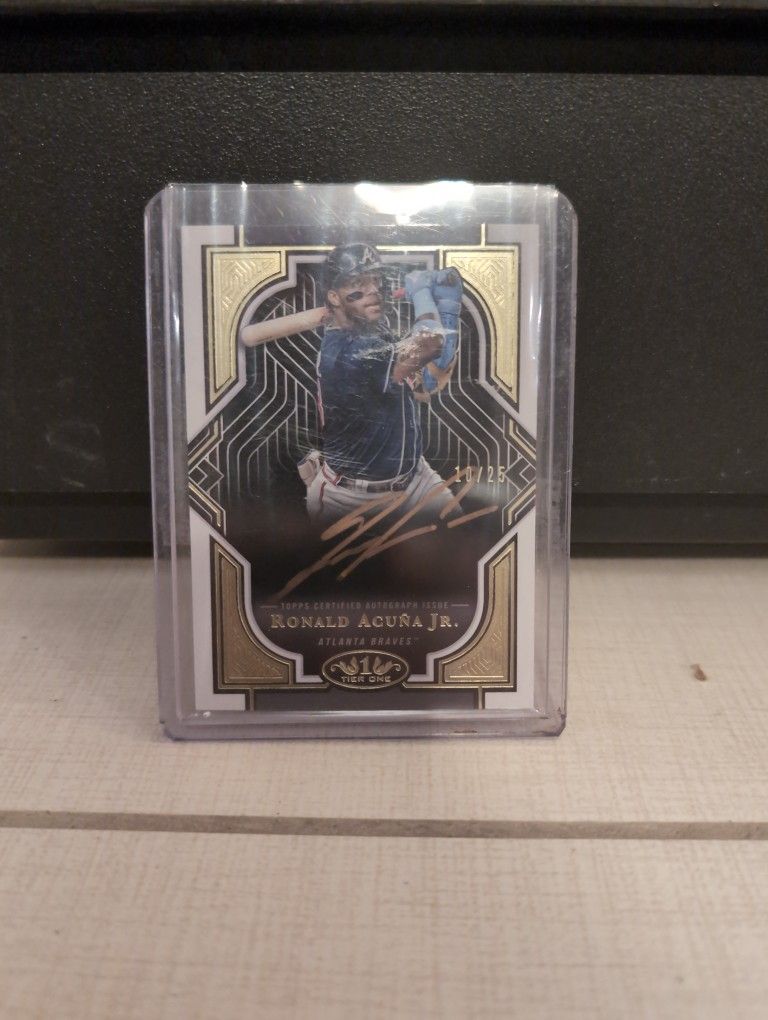 2023 Topps Tier One Ronald Acuña Jr. on‑card autograph, serial numbered just 10/25, featuring the Atlanta Braves superstar in a premium high‑end design. Short‑print, low‑numbered Acuña autos from Tier One are highly sought after by Braves fans and modern MVP‑level collectors. Perfect for any Acuña PC or as a centerpiece card, stored in a sleeve and top loader and ready to ship securely with tracking.