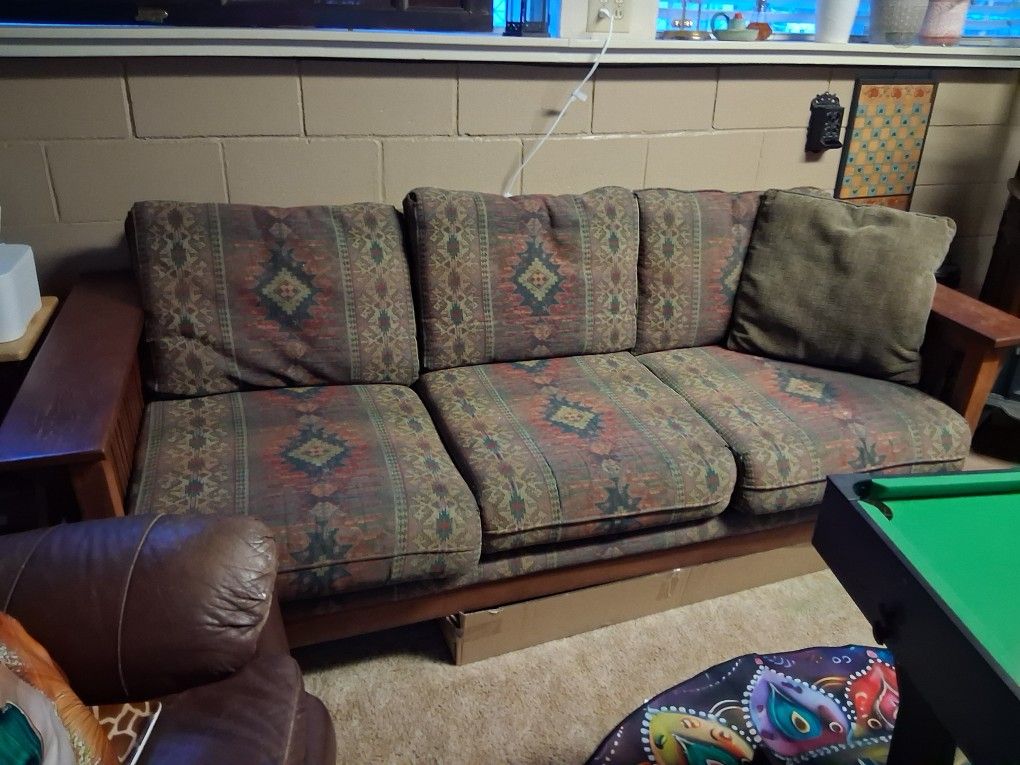 Very well made and in great shape. No rips or holes. Very comfy and goes with any decor. Heavy wood frame.