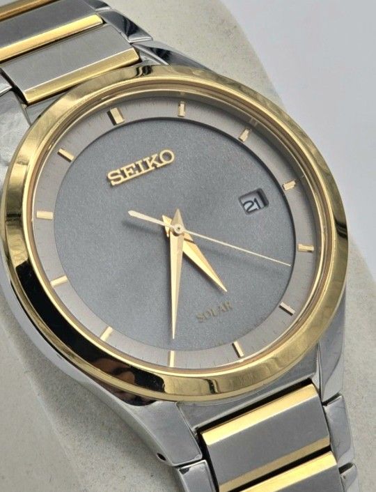 Up for sale is a pre-owned Seiko two tone solar watch. Watch is in good condition, with some small scuffs and scratches that are hardly noticeable. Watch glass has very light small scratches. Watch does not come with original box or papers. PLEASE SEE PICTURES PROVIDED FOR BEST DESCRIPTION!!!! The Seiko Two Tone Solar Men's Watch is a stvlish wristwatch designed for men.