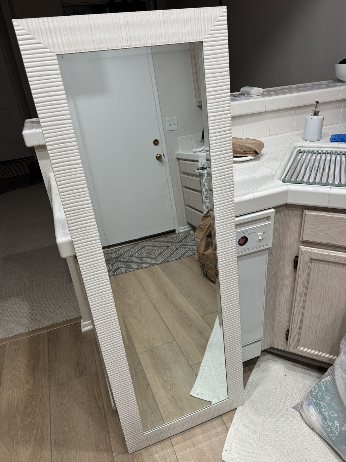 White beachy wood framed mirror. Hangs over the door.