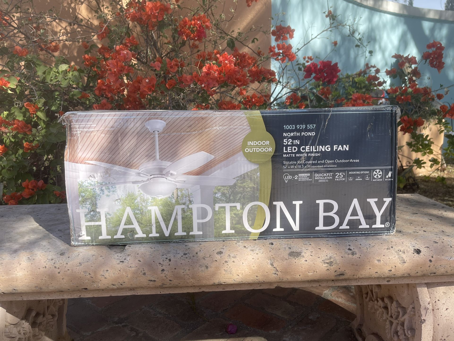 BRAND NEW IN BOX Hampton Bay North Pond 52” LED Ceiling Fan Matte White Finish Indoor/Outdoor $40 OBO 62 in W x 18.3 in H