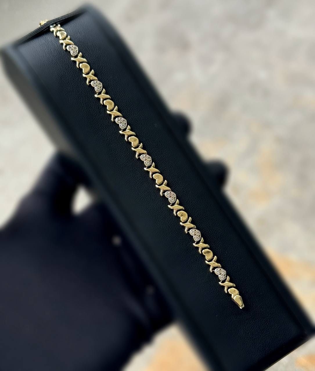 Gorgeous 14k yellow gold XO heart white cz stones bracelet 7.75 inches long, 6.00mm width bracelet π¦π₯ 7.30 gramsπ° Beautiful and stylish. Popular design. The best choice for you! Perfect gift! β€οΈππ The total carat weight of the white cz stones is approximately 2.00CTW We buy Rolex and Audemars, patek . Do layaway in VIP PAWN Coral Springs π₯ππΈ