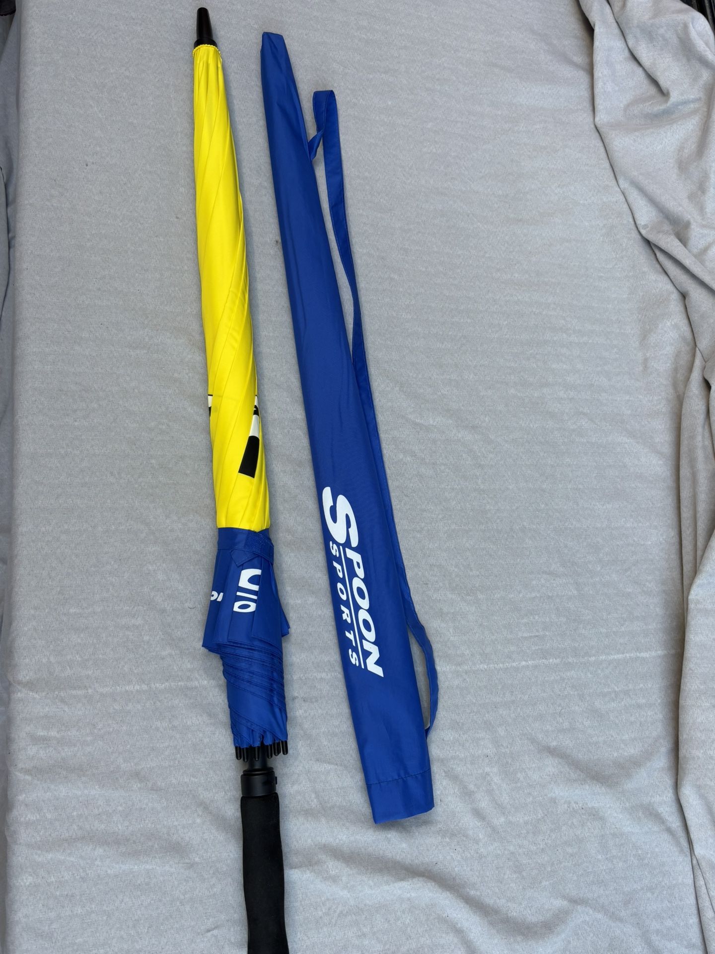 Authentic Spoon Sports Umbrella. Features automatic opening mechanism and a carbon simulated shaft. Includes blue Spoon Sports carrying sleeve. Spoon Sports USA Official Merchandise. 52 inch diameter 40 inches tall 6 inch foam pad grip Light weight durable carbon simulated shaft Spring loaded open Easy Close Blue Spoon Sports sleeve with carrying strap