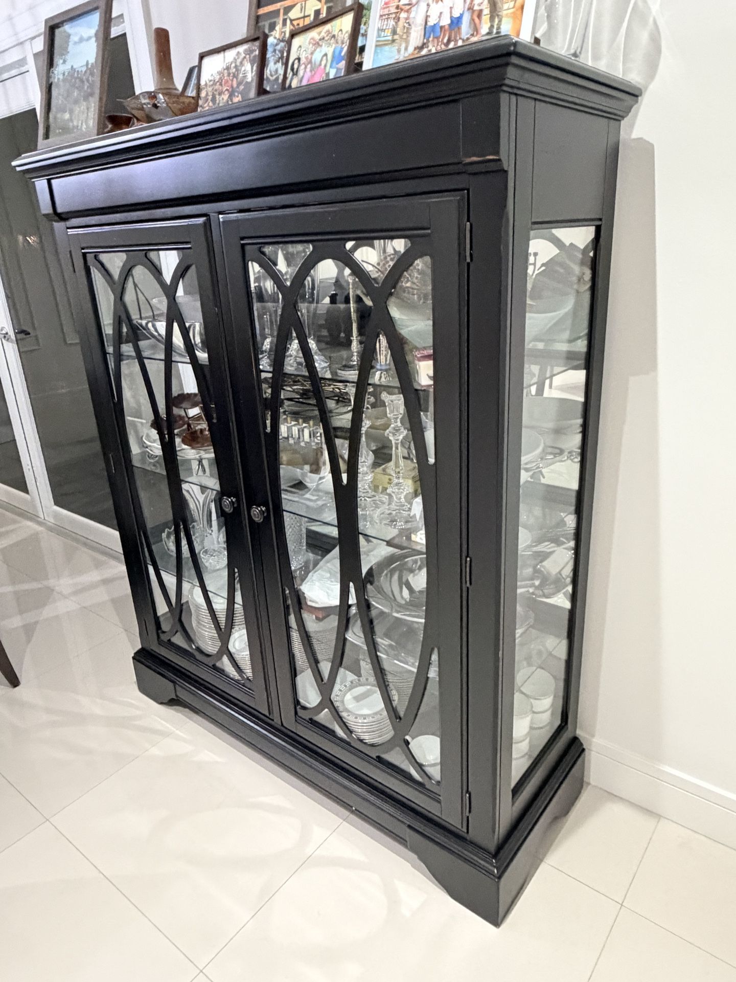 Beautiful dark wood china cabinet. Has three glass shelves. It also lights up when plugged in. Very beautiful. Don't want tto sell it but need more room. Goes to best offer.