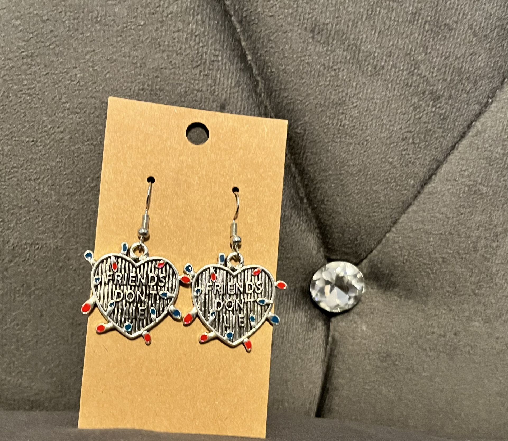 Fashion jewelry earrings... Stranger Things theme, silver tone, “Friends Dont Lie” , new condition