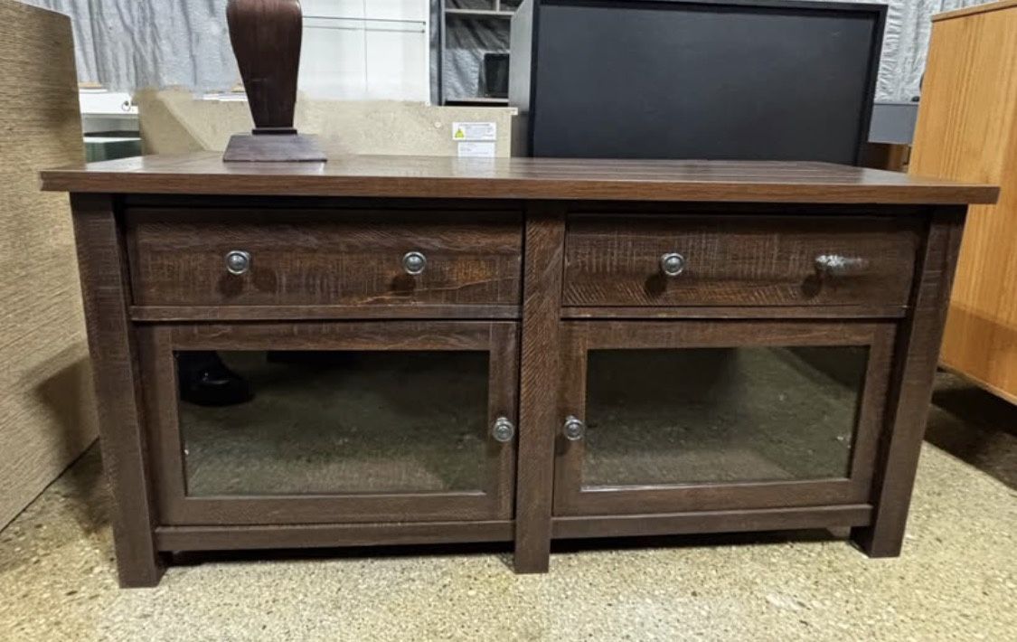 New Media Entertainment Center with Tempered Glass Doors * Dimensions: 65” W x 30” H x 20” D * Features solid 2 Storage Drawers * 2 Glass Doors that open to reveal an adjustable shelves * Fully Assembled * Verified Trusted Seller / Read/ See My Reviews! Follow Me For Amazing Deals Listed Daily!