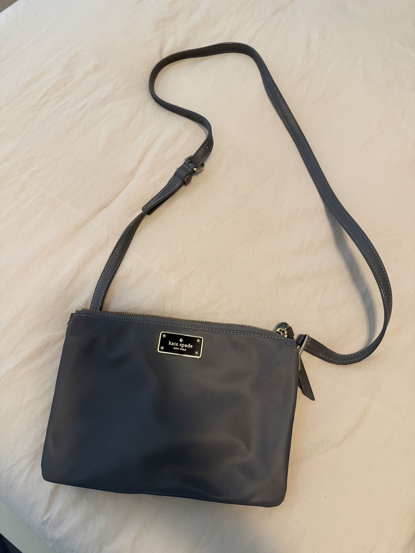 Grey Kate Spade crossbody purse. Adjustable strap. In great condition. No stains or tears. 3 inside compartments.