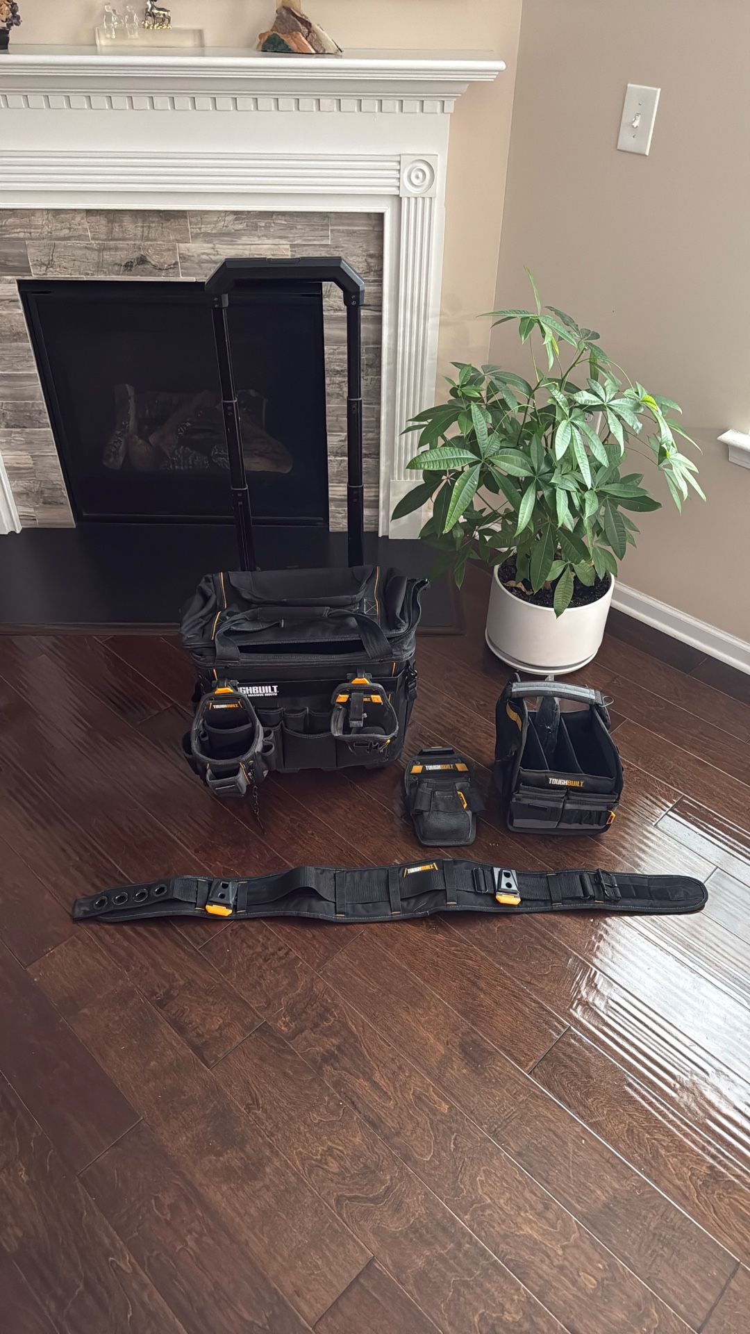 TOUGHBUILT Massive Mouth Hard Bottom XL Black Polyester 18-in W x 14.5-in D x 19.5-in L TOUGHBUILT ClipTech Pro Padded General construction Polyester Tool belt And bunch of pouches and drill holster
