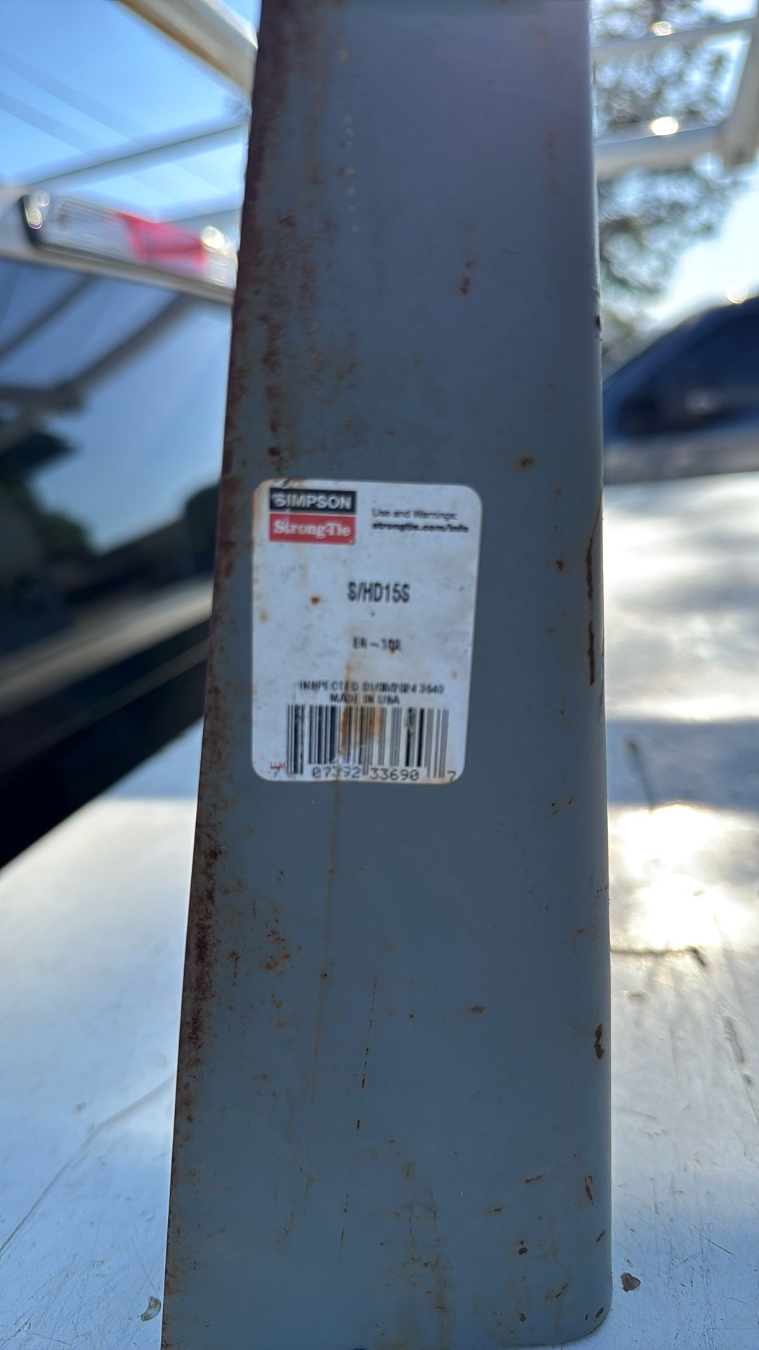 Simpson Strong Tie #S/HD15S. Have about 20 available. They have sat outside and have surface rust. $20 eqch or all for $300