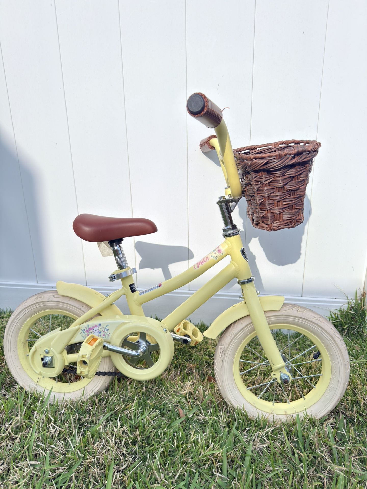 Selling kids’ bike with basket, 12.5” wheel size. Yellow color with brown leatherette details. Pickup in Winter Garden.