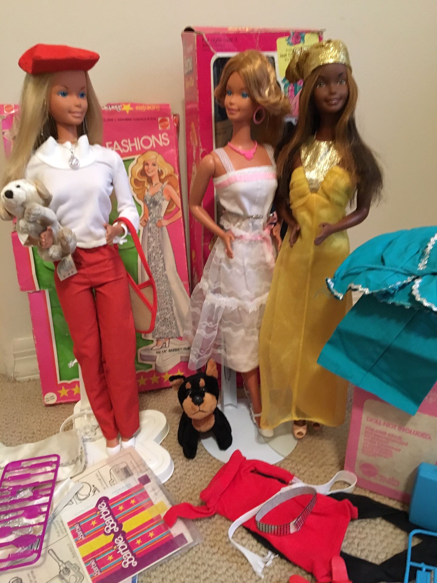 Here are two supersize Barbies and one supersize Christie doll. They come with 3 extra outfits . The necks have some melt marks and Christie’s body is cracked but the display nicely.