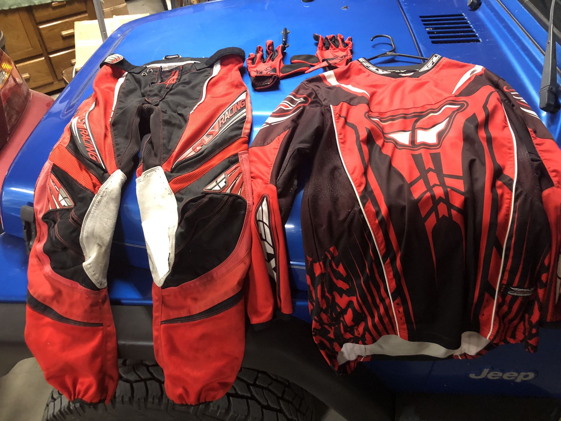 Fly motocross outfit Pants 32 hole in knee taped up Shirt lg Gloves lg
