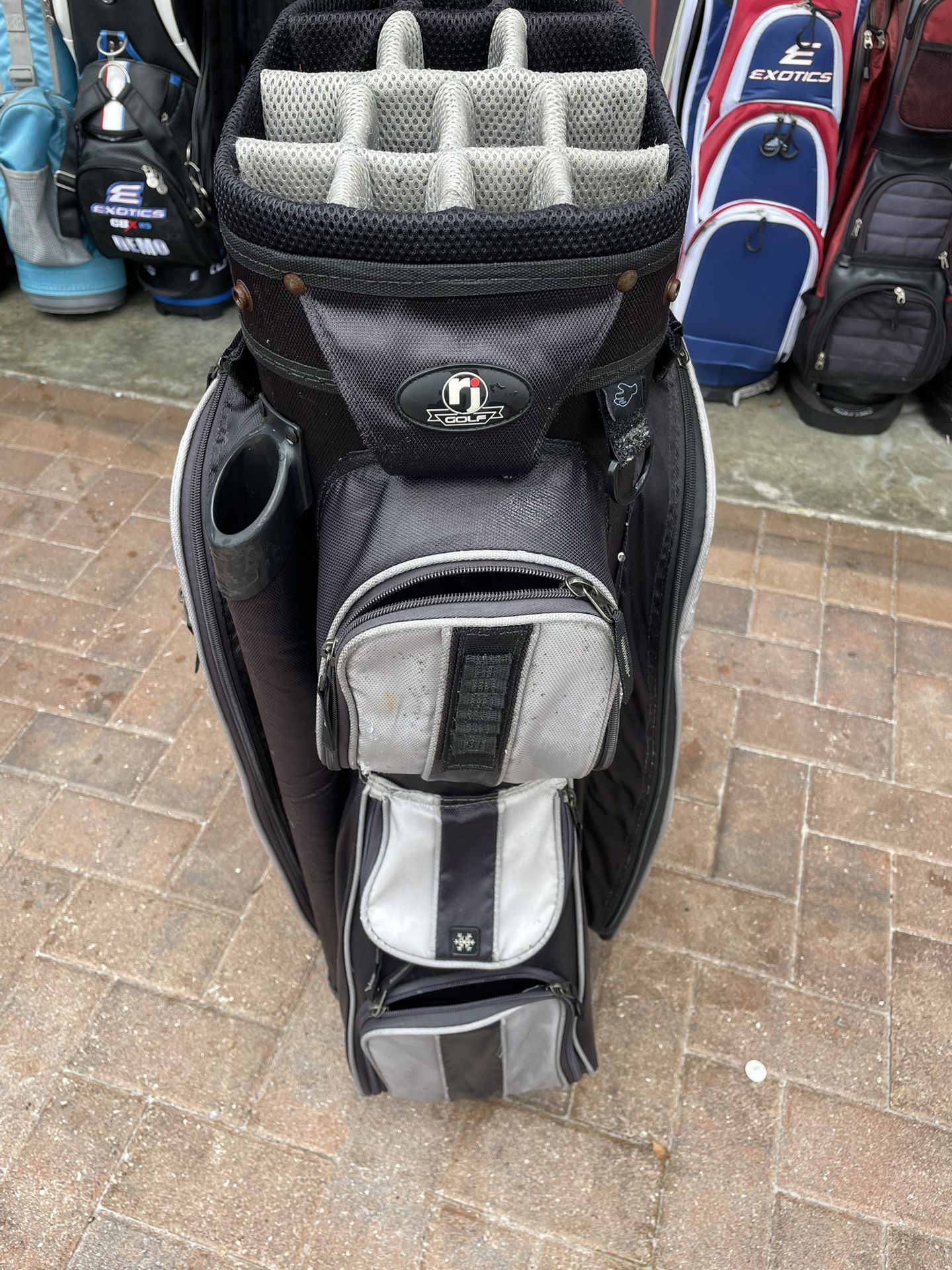 Golf Cart Bag By RJ With 14 Club Dividers , Cooler Pocket and shoulder strap . See pictures for details and conditions .