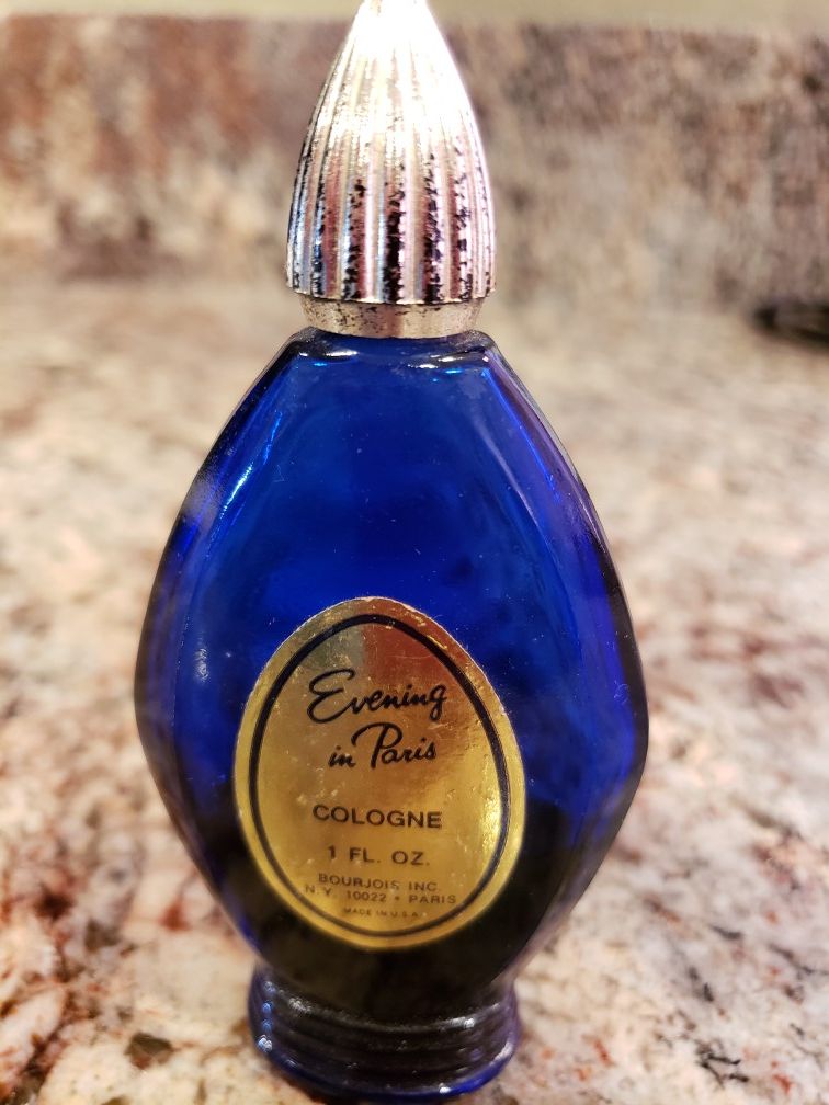 1950's vintage cobalt blue glass bottle. Evening in Paris Cologne by Bourjois. 1oz , handed down from grandmother