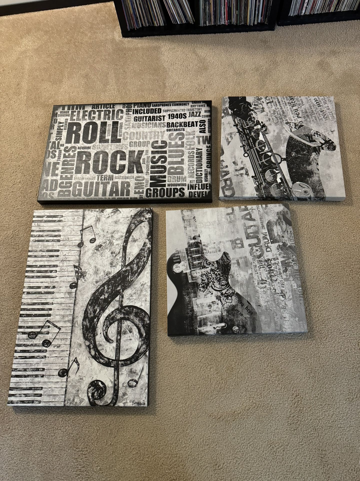 Music related pictures for the music lovers out there. These prints are on canvas and attached to wooden frames 2@ 20”x 20” 2@ 20” x “30” Excellent condition due to them just hanging around. Would like to sell all 4 as a set if possible.