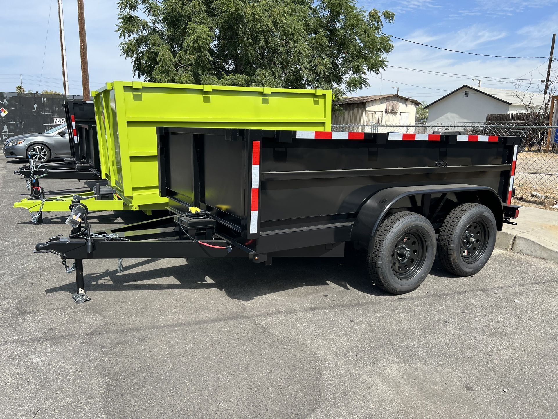 New dump trailer 8x10x2 2-3500 lbs axles 1-rear electric brake Brake away kit 2-rear barn doors In stock 2-years warranty $4895 + tax & lic Manufacturers licensed & bonded Financed available 100 miles free delivery Am located in Colton Hablo español