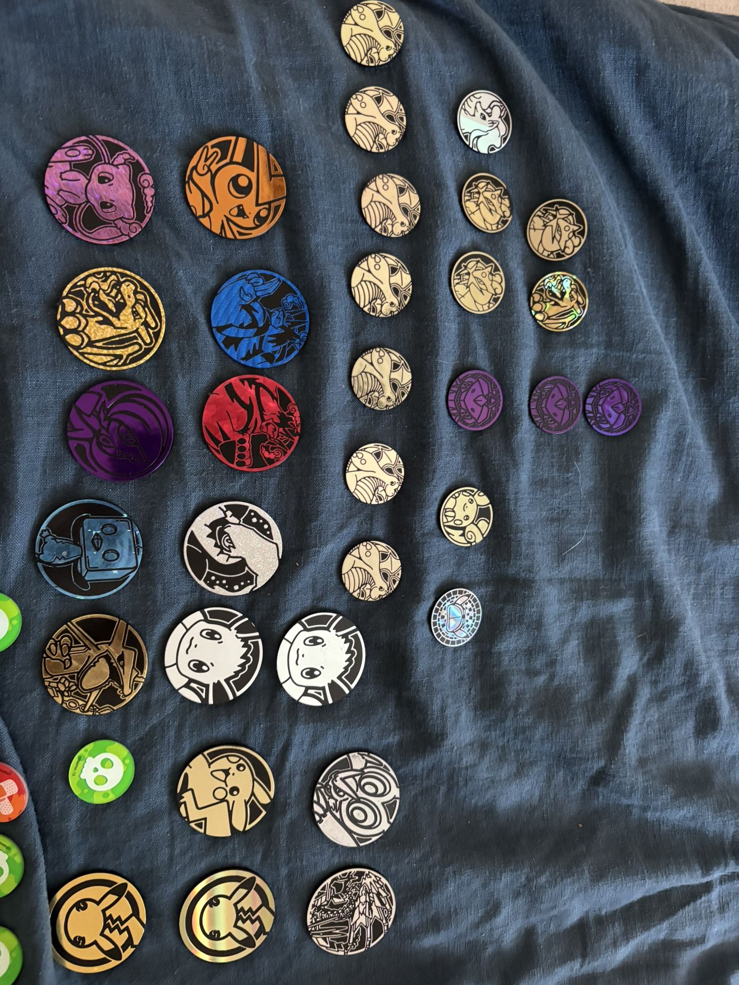 I have a collection and jumbo and smaller Pokemon coins. A few duplicates, some are common and some are rare with maybe a few scratch marks but not to bad. Dice and damage coins are in great condition as well. The whole bundle I’m asking $150 OBO