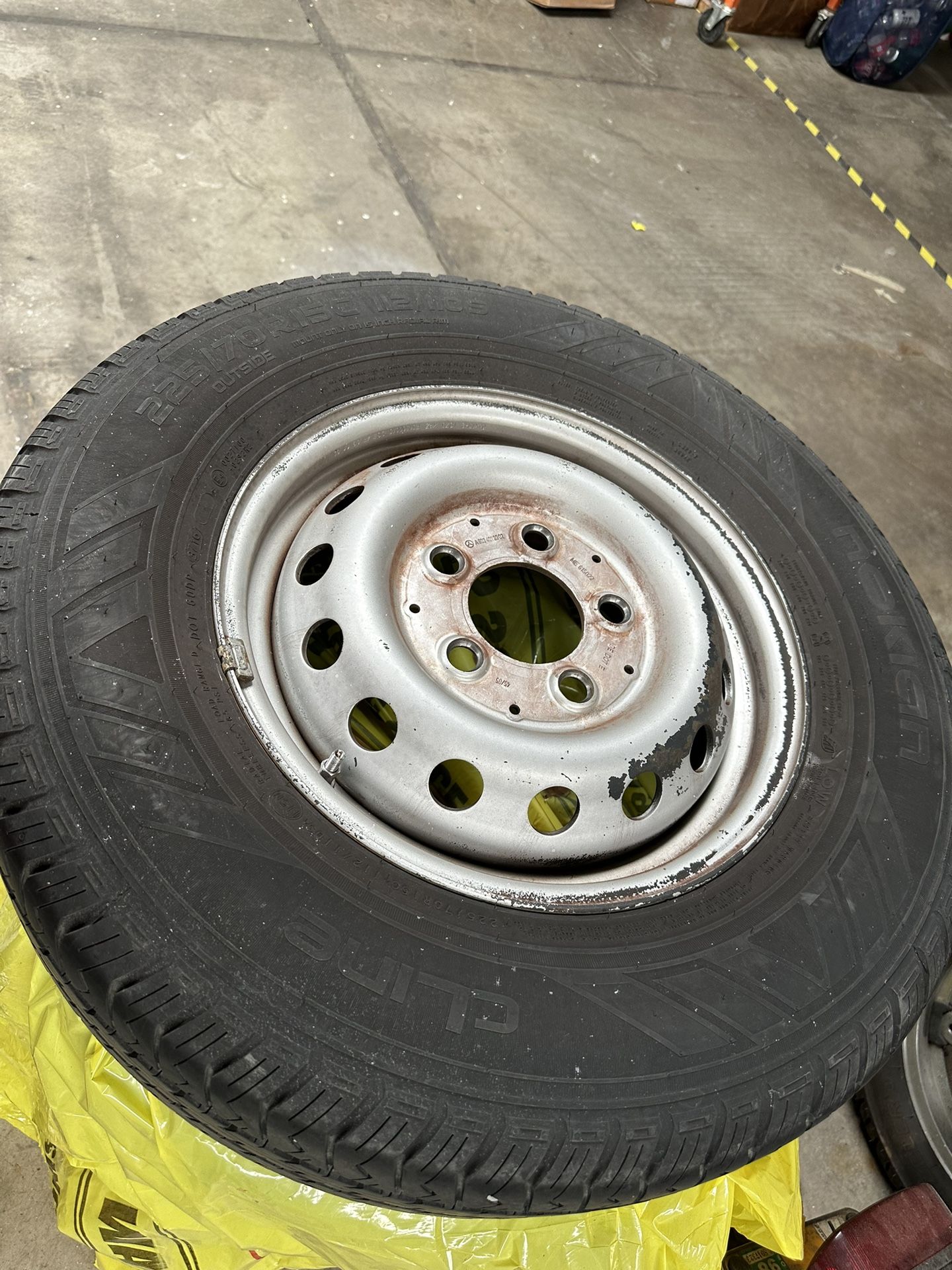 4 oe Mercedes 15” wheels and clone 225/70r15c tires. Like new 12mm+ of tred left. New chrome valve Stems and balanced.