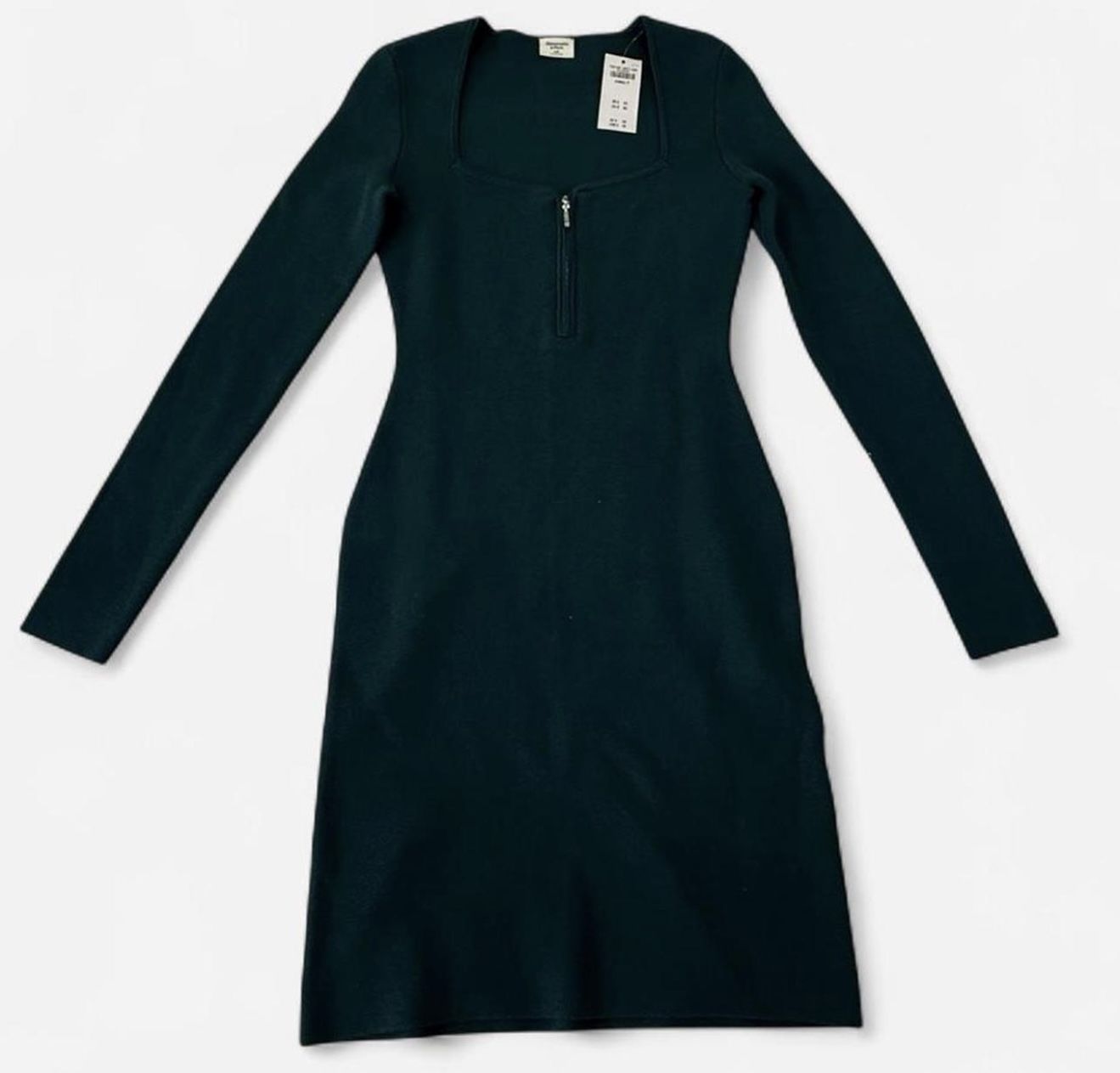 Make a sleek statement in this form-fitting ribbed knit dress by Abercrombie & Fitch. Rendered in a deep forest green hue, this long-sleeve midi dress features a bodycon silhouette, crew neckline, and a subtly contoured seam structure that flatters the waist and hips. Crafted in a stretch knit material, it offers both comfort and polish — perfect for cool-weather outings or evening events. Size XS Petite. New with tags.