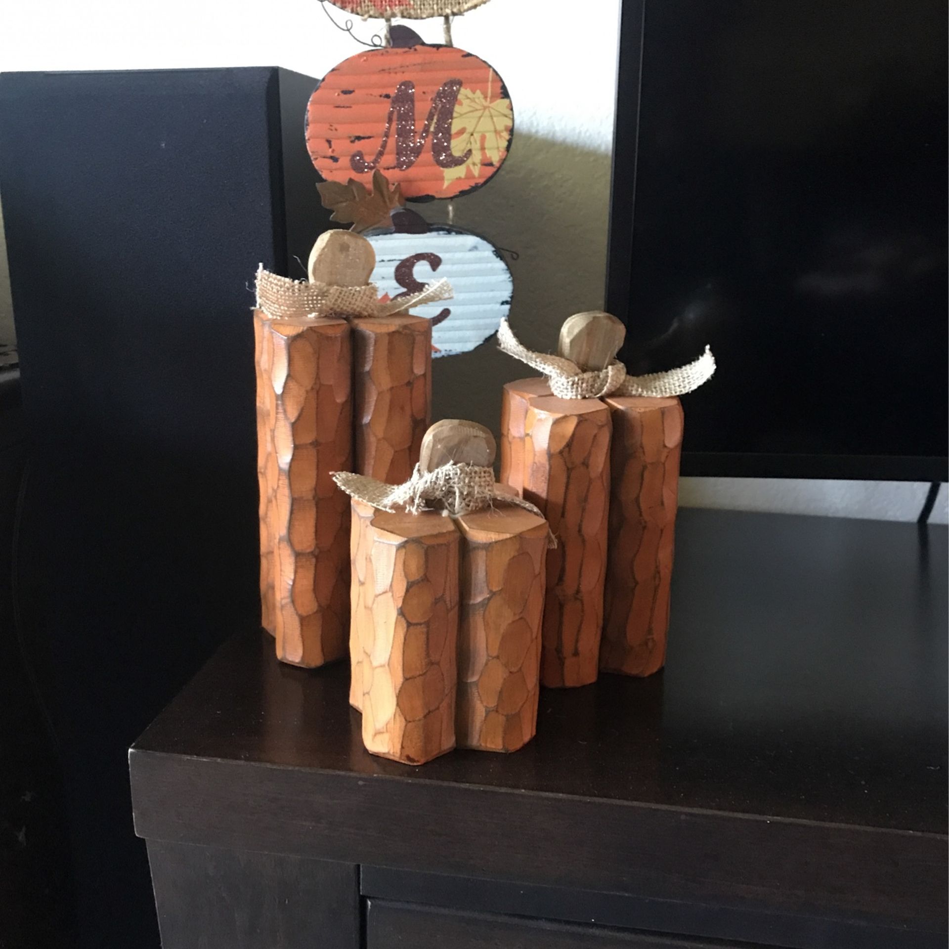 Set of 3 cute wood pumpkins From hobby lobby Wall hang welcome sign Good condition.
