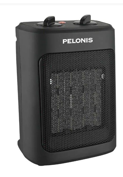 Pelonis small room ceramic heater with adjustable thermostat, 3 heat settings, and a fan. New, Open box.