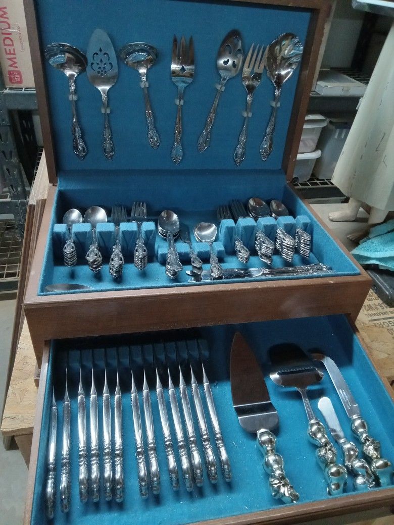 AI Overview +3 This is a set of Oneida Community Modern Baroque silverplate flatware in a wooden chest. The pattern, introduced in 1969, features a detailed, baroque revival design on the handles. The set includes various pieces such as knives, forks, and spoons, along with several serving utensils. The flatware is highly collectible and often used for formal dining or special occasions. It is a silverplate composition, known for durability. Asking $75