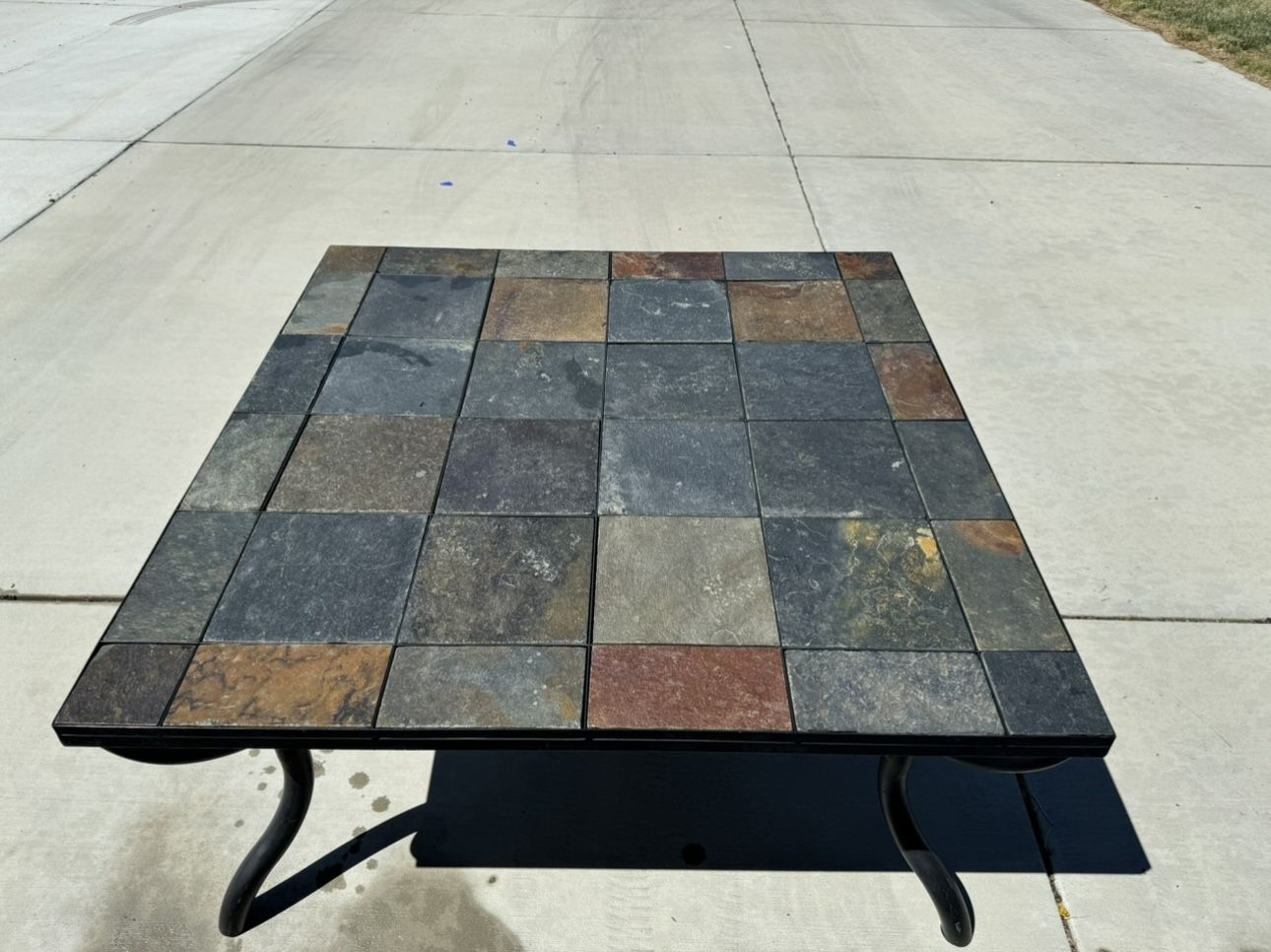 Heavy slate stone square coffee table with storage rack underneath. Measures 40 inches by 40 inches. Too large for my living room.