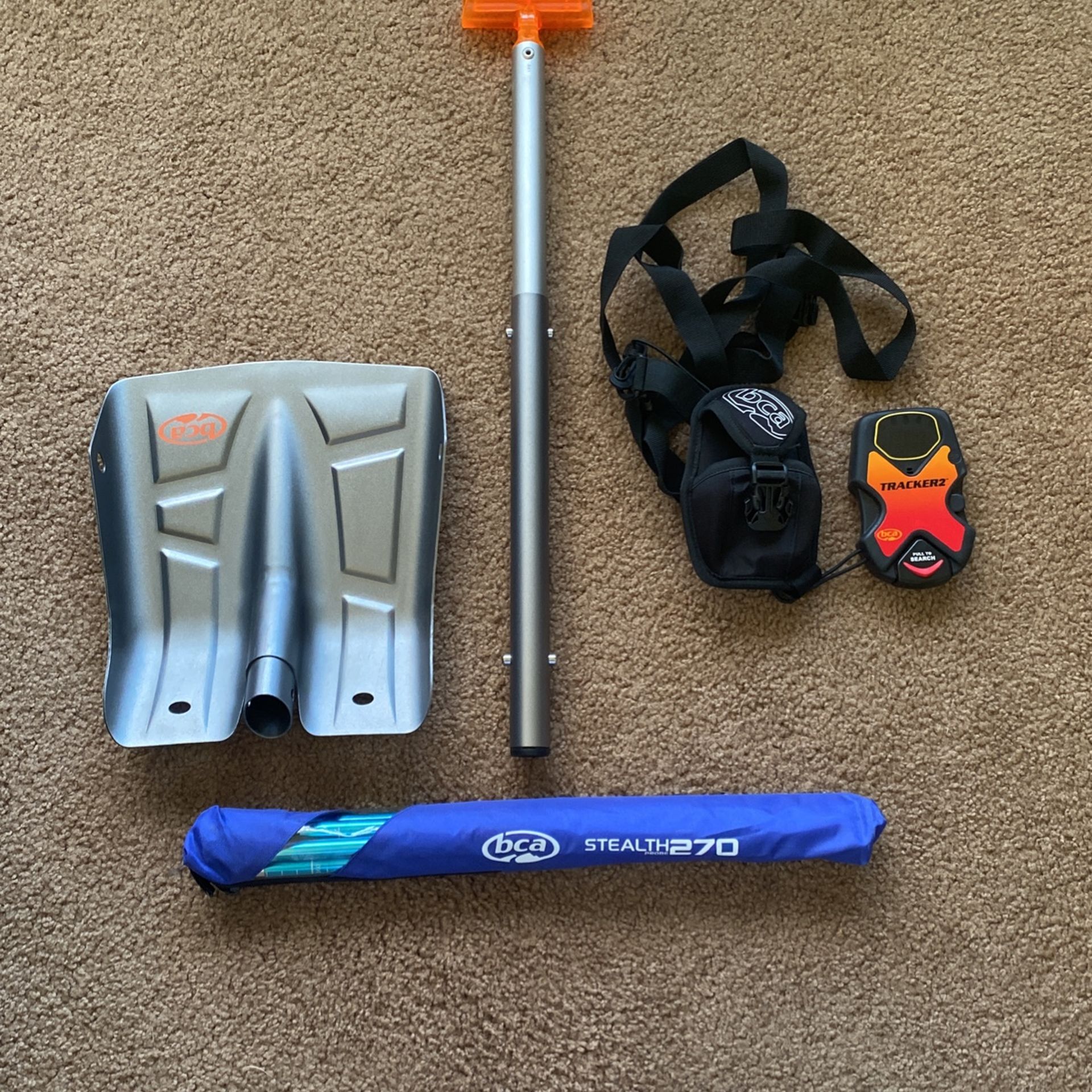 BCA lightweight shovel and stealth 270 probe. Tracker 2 beacon. Like new.