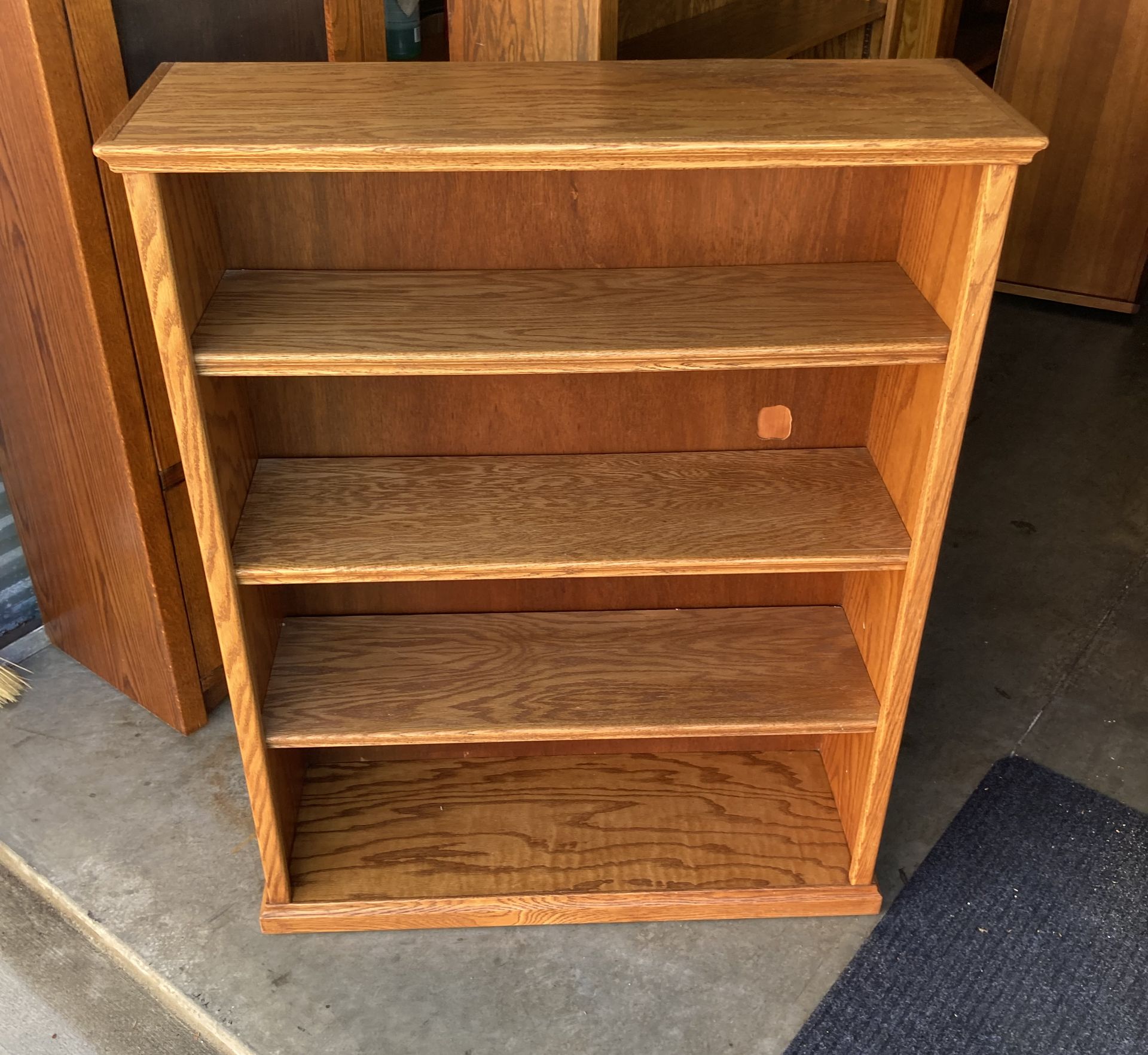 This is a beautifully grained Oak Book case that is solid and sturdy. Measures 37.5" x 12.25” x 48” tall. Oak finish has been renewed with Citrus oil, looks great. This includes 3 adjustable shelves with hardware. Constructed with solid oak and oak plywood / veneers with a one piece wood backing, (1 access hole that has a patch, see pictures). Overall in very good used condition with typical minimal wear. $135 for this storage and display shelf. Pick up in Apple Valley.