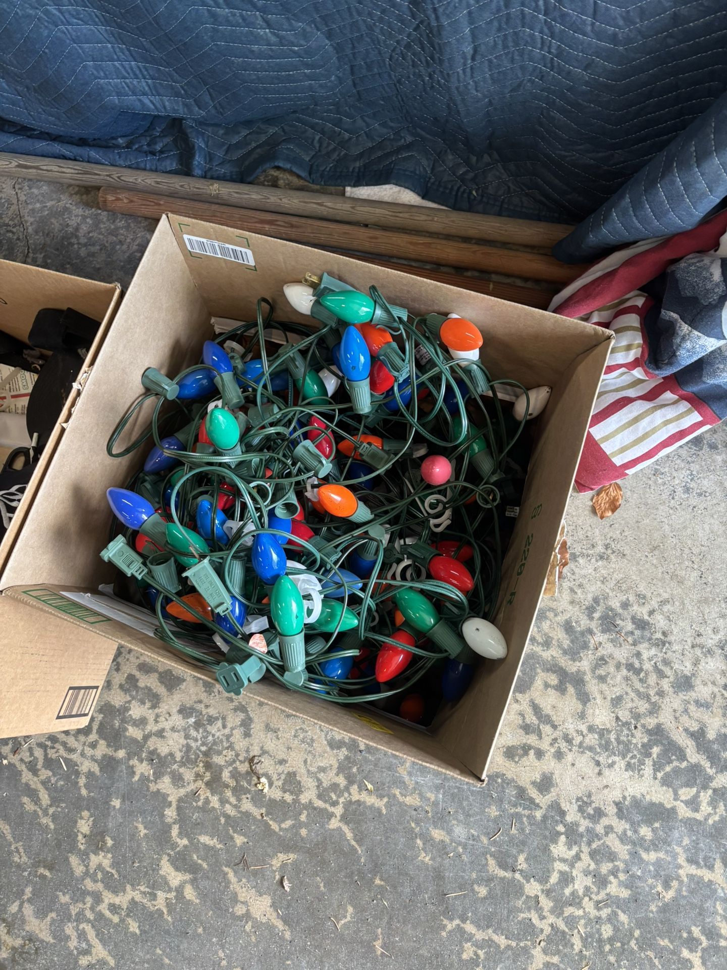 These are the old style glass lights. Several strands, these are the big ones C9. Extra bulbs