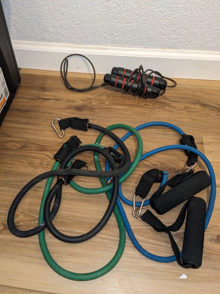 In used condition Comes with 20 lbs 40 lbs and 50 lbs bands and jump rope $15
