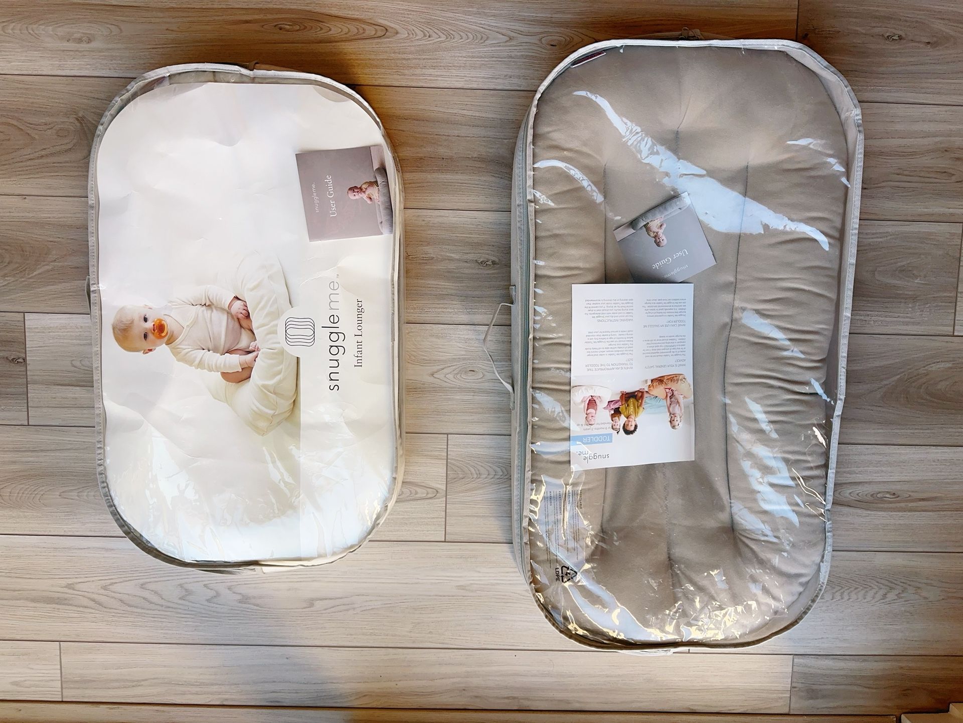 Infant Lounger in Ivory/Natural Color is for 0-9months & Toddler Lounger in Birch Color is for 9months -3years.