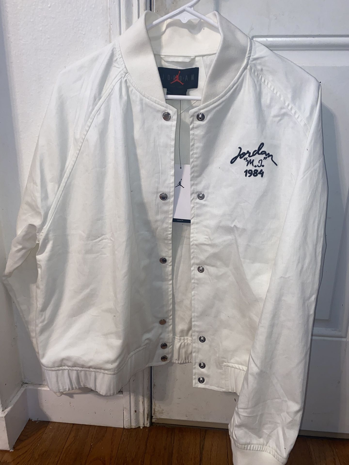 NWT – Brand new with tags, never worn. Item: Jordan Women’s Varsity Jacket in white, made from durable woven cotton. Features legacy-inspired Jordan graphics and classic varsity styling. Details: • Premium woven cotton construction • White varsity jacket with retro Jordan details • Snap-button front • Ribbed cuffs/hem for a perfect fit • Comfortable, lightweight feel • Authentic Jordan brand