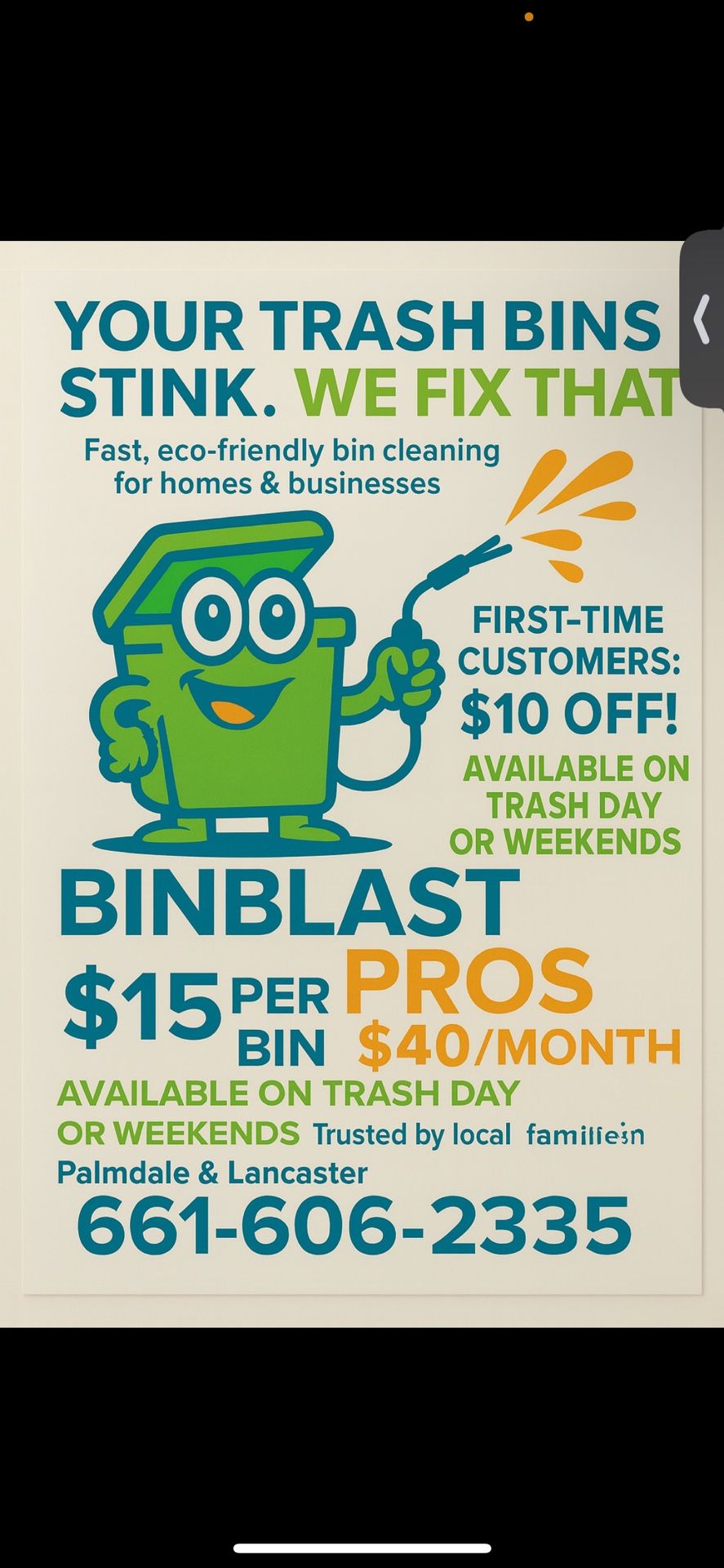 We make your trash bins look and smell brand new! Fast, affordable, and eco-friendly cleaning for homes and businesses. We bring all our own tools and supplies, so you don’t have to worry about a thing. Serving Palmdale & Lancaster — $15 per bin or $40/month. First-time customers get $10 off! Plus, get $5 off your next cleaning for every friend you refer