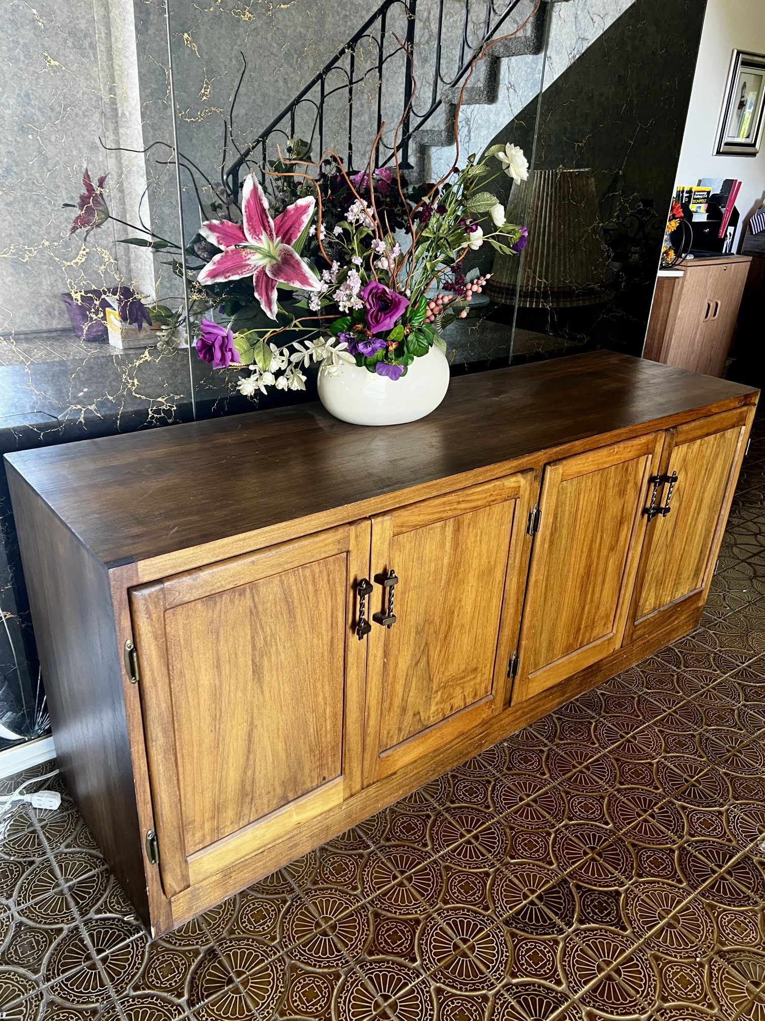 A beautiful wood storage cabinet. Could be used as a sideboard or buffet. It has 4 doors and the interior has a shelf. Solid and heavy, this will require 2 people to move. Located in Mission Viejo. Measurements: 64 3/4" W x 27 1/2" T x 19" D Condition: Good condition overall with a couple minor nicks and marks.